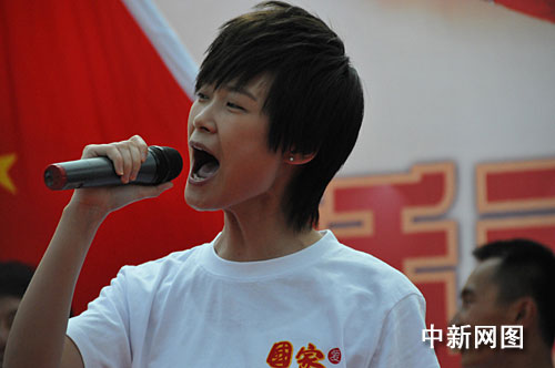 图为李宇春在为北川中学师生演唱歌曲。中新网记者 唐伟杰 摄