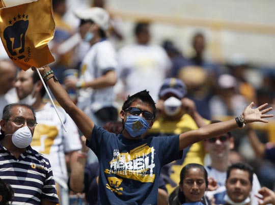 5月10日,在墨西哥足球联赛的一场比赛中,观众戴着口罩为自己支持的球队加油助威。目前墨西哥各级联赛已经恢复比赛,所有的体育馆都被要求将观众人数限制在一半左右,并且建议到场球迷戴口罩。
