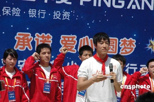 5月11日,以“承诺、爱心、圆梦”为主题的“新农村 新希望”中国平安希望小学支教行动出发仪式,在四川省北川平安小学举行。著名运动员刘翔带领本年度希望小学支教行动首批12名志愿者共同宣誓,表示将奉行志愿者宗旨,践行志愿者精神,遵守志愿者规范,塑造志愿者形象,以己所能服务于公益爱心事业,服务于社会。这12名来自全国的优秀志愿者将带着自己亲手撰写的教案,在北川平安小学开展为期一周的支教活动。中新社发 肖龙联 摄