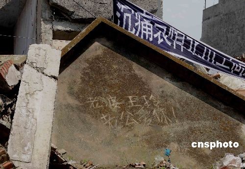 去年“5·12四川大地震”一位幸存丈夫,在遭摧毁的北川老县城妻子遇难处废墟上,刻写催人泪下的留言而感动人间。大地震一周年祭日之时,废墟上的留言经过风风雨雨依然保持,如在今天。中新社发 贾国荣 摄