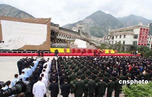 5月12日下午,纪念四川汶川特大地震一周年大会在震中映秀镇举行。在武警号兵的悲壮号声中,出席大会的中共中央总书记、国家主席胡锦涛等领导人与现场与会人员共同为遇难者默哀。中新社发 任晨鸣 摄