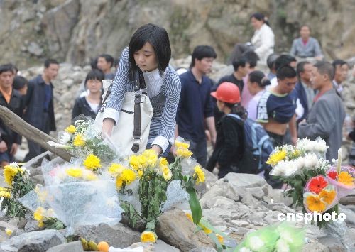 五月十二日是“四川特大地震”一周年祭日,一名女孩来到曾遭摧毁的北川老县城,面对遇难同胞的废墟献上一束菊花。中新社发 贾国荣 摄