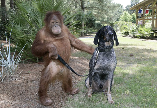 据英国媒体5月14日报道,在美国南卡罗来纳州,7岁的猩猩Suryla和3岁的布鲁泰克猎犬Roscoe是最好的朋友。它们在美特尔海滩的T.I.G.E.R.S庇护所里总是一起吃东西、游泳,甚至共骑一头27岁的非洲象。15日,他们将在一起在美国著名的电视节目奥普拉脱口秀上出镜。