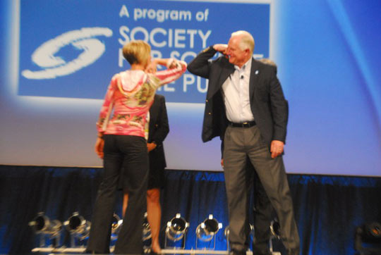 近日,在美国内华达州召开的第60届“英特尔国际科学与工程大奖赛”上,英特尔董事长贝瑞特和主持人大玩“撞肘”表演。 为防范H1N1流感,一些美国人见面礼改为“撞肘”。