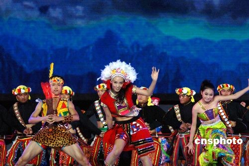 5月16日,首届海峡论坛大型文艺晚会“中华情 海峡缘”在厦门会展中心举行,六千五百多名嘉宾参加,其中台湾嘉宾四千多名。图为文艺晚会上热情的台湾原住民舞蹈。中新社发 傅丹丹 摄