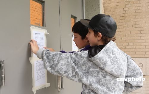 纽约华人聚居区之一的法拉盛第25初中当天停课,两名学生在阅读张贴在校门外的相关通知。