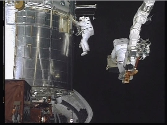 美国航天局18日发布消息说,“阿特兰蒂斯”号航天飞机上两名宇航员当天进行太空行走为哈勃太空望远镜更换了三块电池、一个恒星追踪传感器以及热屏蔽罩,完成了对哈勃的最后一次维护工作。美国航天局公布的视频截图显示两名宇航员正在对哈勃太空望远镜进行维护工作。
