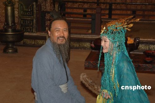 5月20日,胡玫的年度大戏《孔子》首次开放记者探班,十位记者齐聚涿州,揭开了这部“神秘大戏”的面纱一角。当天下午,剧组拍摄的是一场重头戏“子见南子”,饰演孔子的周润发、饰演南子的周迅、饰演颜回的任泉,饰演鲁定公的姚橹,饰演孟孙何的王斑和饰演季孙斯的陈建斌等主要演员一一亮相。图为“子见南子”拍摄现场,讲述南子“挑逗”孔子,孔子坐怀不乱。然而在采访时周迅也透露了一个令人惊讶的消息——她和发哥的对手戏原来仅此一场,看来南子和孔子之间,恐怕是没法擦出什么暧昧的火花了。 中新社发 李学仕 摄