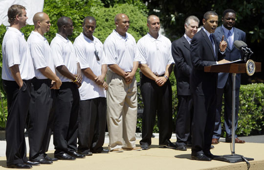 奥巴马白宫宴请超级碗冠军并获赠球衣(2)