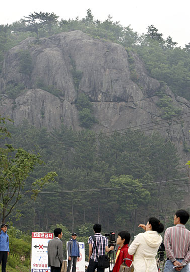 5月23日,韩国前总统卢武铉在位于庆南金海市峰下村的峰下山跳崖身亡。众多媒体记者云集该处等待韩国警方发布最新进展情况。