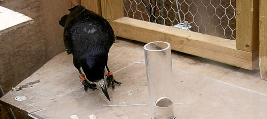据英国媒体26日报道,近日,英国剑桥大学的研究员针对乌鸦进行了一项实验。实验中,研究人员在桌上放了一个装有蠕虫的试管,试管的旁边放了一截足够长的笔直的铁丝,乌鸦为了吃到食物,竟然会用铁丝自制工具,最终吃到了食物。