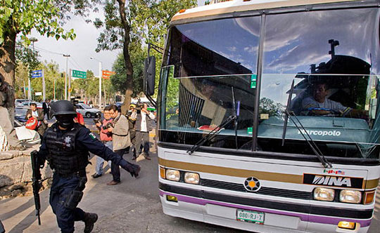 5月26日,墨西哥最高检察院发布公报说,墨西哥中部米却肯州27名高级官员因涉嫌同当地贩毒及有组织犯罪集团勾结被逮捕,其中包括10名市长。图为联邦警察在墨西哥城护送载有被逮捕官员的车辆。