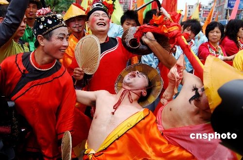 5月28日,在侨乡晋江历史名镇安海举办的端午民俗文化节上,大型古民俗以踩街形式汇集街头,安海“嗦囉嗹”、下山后(“到”左去至加台)狮阵、火鼎公婆、拍胸舞、车鼓唱、扒龙船、花轿迎亲、晋江马队……一众民间艺人轮番亮相,为海内外宾朋献上原汁原味的文化大餐。图为国家非物质文化遗产、有活化石之称的千年安海“嗦囉嗹”民俗在古镇街头上演。中新社发 傅丹丹 摄