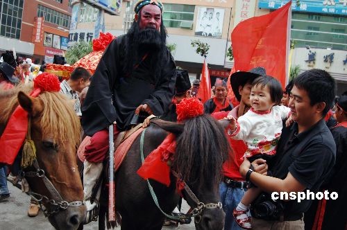 5月28日,在侨乡晋江历史名镇安海举办的端午民俗文化节上,大型古民俗以踩街形式汇集街头,安海“嗦啰嗹”、下山后刣狮阵、火鼎公婆、拍胸舞、车鼓唱、扒龙船、花轿迎亲、晋江马队……一众民间艺人轮番亮相,为海内外宾朋献上原汁原味的文化大餐。图为“八仙”骑着珍贵的晋江马出现在踩街队伍里引人注目。现仅存百余匹的晋江马,已有一千多年历史,因濒临灭绝而成为国家级畜禽遗传资源保护品种,备受社会各界关注。中新社发 傅丹丹 摄