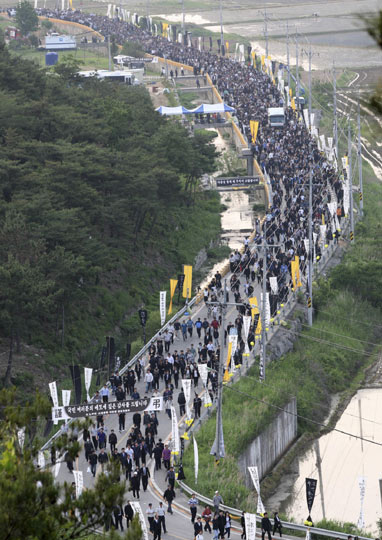 众多民众前往庆尚南道金海市峰下村附近送别卢武铉。
