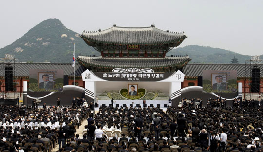 5月29日,韩国前总统卢武铉的遗体告别仪式在首尔市中心的景福宫举行。图为吊唁者在首尔景福宫卢武铉的遗体告别仪式现场。