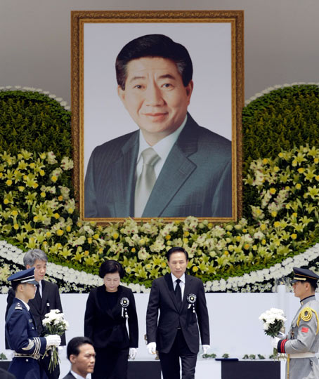 5月29日,韩国前总统卢武铉的遗体告别仪式在首尔市中心的景福宫举行。韩国总统李明博及其夫人出席仪式。
