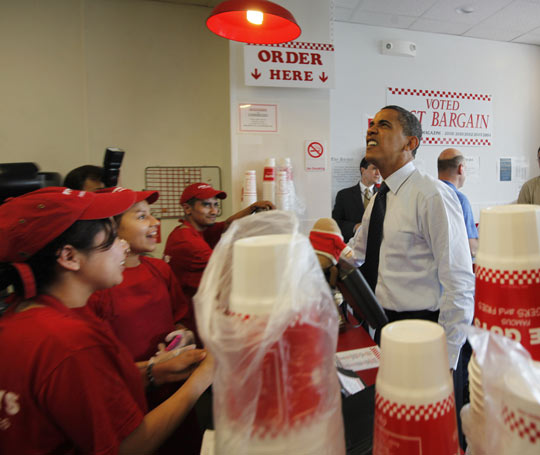 当地时间5月29日,美国总统奥巴马亲自到华盛顿一家连锁快餐店为白宫员工买汉堡。在排队期间,奥巴马吃了点零食,与其他顾客聊天,也有人要求与他拍照留念。