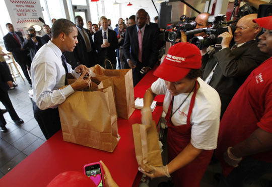奥巴马外出为白宫员工买汉堡 排队时吃零食(图)