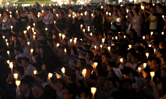 29日晚,韩国民众在首尔为前韩国总统卢武铉举行烛光祭。
