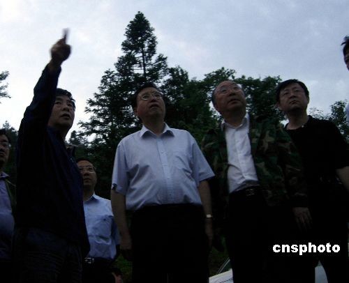 图为山体滑坡现场,张德江听取王鸿举介绍情况。 中新社发 郭晋嘉 摄