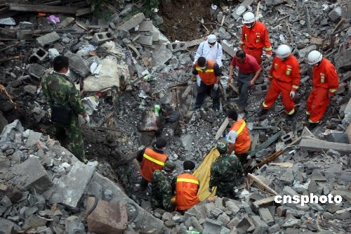 6月7日下午,第一具遇难者遗体被救援人员在瓦砾下找到。5日下午3时许,重庆市武隆县铁矿乡鸡尾山突发山体垮塌,直接导致山对面的三联采矿场和当地居民及一些路人被掩埋,目前已找到7具遇难者遗体,另尚有67人下落不明。 中新社发 杜远 摄