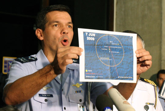 巴西军方发言人7日晚称,已打捞起法航447航班客机的部分残骸和17具遇难者尸体。巴西军方发言人还表示,数10件来自法航447航班客机的结构零件也被打捞上来。图为巴西空军军官在地图上指出所发现的一部分遇难者尸体的方位。