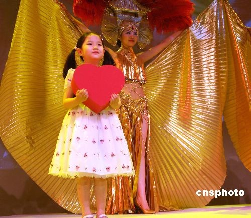图为节目尾声,编创胡晓丹的女儿胡水(左)捧着一颗红心,在多位身着金色长裙、头戴夸张羽饰的模特映衬下,缓缓走上舞台中央,与其它五位模特头上各异的“爱”字相呼应。中新社发 耿军 摄