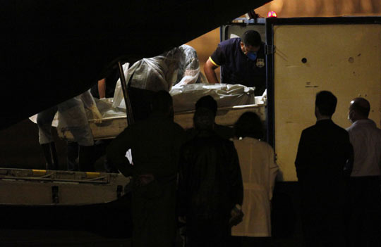 当地时间10日晚,装有第一批法航失事客机16具遇难者遗体的大力神C-130飞机降落在巴西东北部城市累西腓。专家将于11日上午对这些遗体进行解剖。图为工作人员将法航失事客机遇难者遗体从飞机上移至冷藏车内。