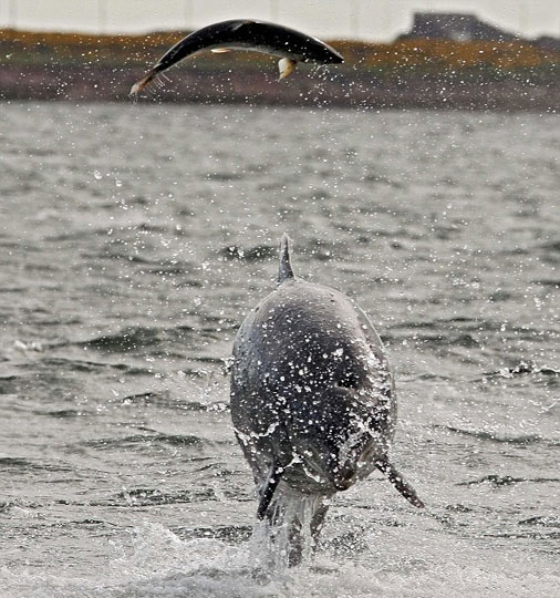 据英国媒体11日报道,英国业余摄影师詹姆斯·摩尔近日在英国因佛内斯附近水域拍到了宽吻海豚群捕猎野生鲑鱼的精彩瞬间。