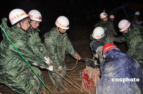 6月11日凌晨,重庆消防官兵在运送排水管道焊接设备。6月5日发生的重庆武隆县铁矿乡山体垮塌事故造成70多人被埋,大面积的崩滑体将两山之间的河流截断,形成了一个坝高百多米的堰塞湖。由于连日降雨,鸡尾山堰塞湖水位持续上涨。重庆启动了堰塞湖排危处置方案,将通过整理堰塞湖上游左岸凹槽,用大流量抽水设备将积水抽排至下游。救援人员连夜铺设了长约1公里的堰塞湖出水管道,估计11日晚可实现抽水作业。中新社发 雷健 摄