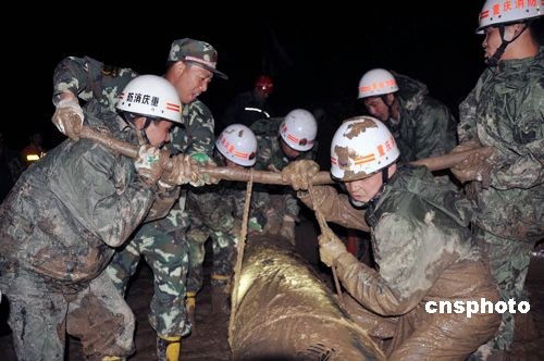 6月11日凌晨,消防官兵冒雨搬运排水管道。6月5日发生的重庆武隆县铁矿乡山体垮塌事故造成70多人被埋,大面积的崩滑体将两山之间的河流截断,形成了一个坝高百多米的堰塞湖。重庆启动了堰塞湖排危处置方案,将通过整理堰塞湖上游左岸凹槽,有计划地抽排积水到下游。救援人员连夜铺设了长约1公里的堰塞湖出水管道,估计11日晚可实现抽水作业。中新社发 陈山 摄