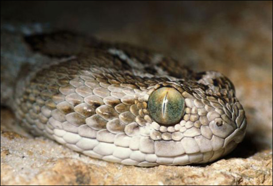 锯鳞蝰:这种蛇体长大约60厘米,被认为是世界上毒性最强的毒蛇之一。人一旦被它咬伤很少能活下来,特别是在偏远无人的沙漠地带。锯鳞奎蛇很好辨认,短小头部呈现三角锥状或箭头状。