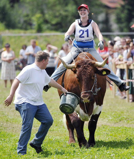 组图:德国小镇举行别开生面的骑牛大赛(3)