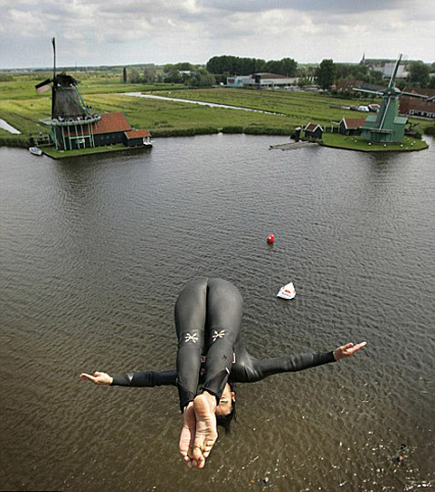 从直升飞机上拍摄的Orlando Duque跳下瞬间。