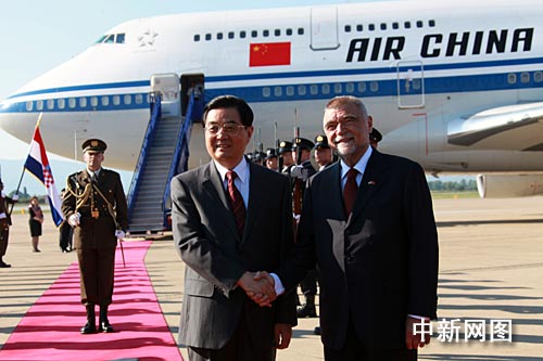 当地时间十九日下午,中国国家主席胡锦涛抵达萨格勒布,开始对克罗地亚进行国事访问,克罗地亚总统梅西奇亲自到机场迎接,身着民族服装的克罗地亚少年儿童向胡锦涛主席献上美丽的鲜花。中新社发 齐彬摄