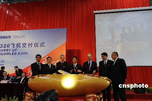 6月23日,中国组装首架A320飞机在空中客车天津总装厂交付使用。图为交付仪式现场。 中新社发 田齐 摄