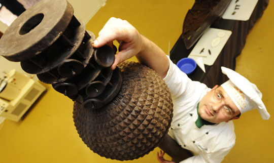 6月24日,在德国北部城市派讷,一名甜品师展示用巧克力制作的柏林电视塔模型。今年是柏林电视塔落成40周年。
