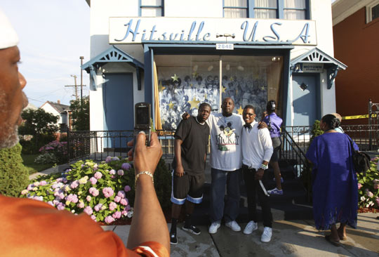 美国底特律歌迷在迈克尔·杰克逊宣传窗外合影