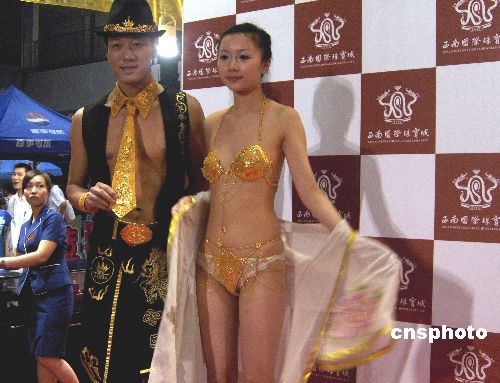 6月27日,重庆婚博会展出一件沿用明清宫廷工艺精制而成的,标价达400万元人民币的女式天价黄金内衣。中新社发 姜诚意 摄