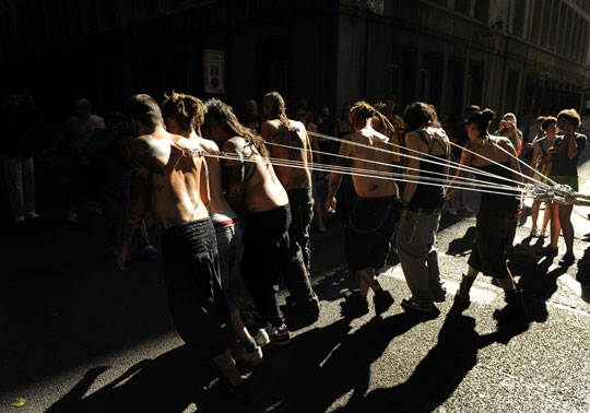 组图:另类团体街头表演人体挂铁钩拉车(5)