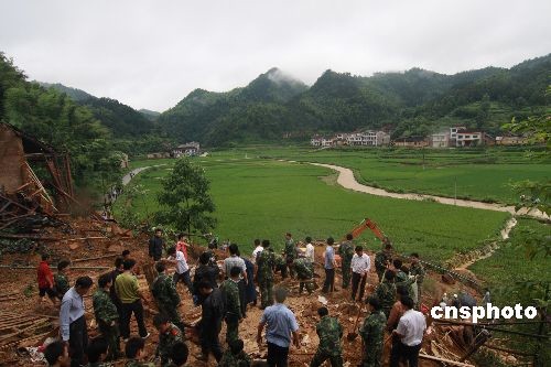 7月2日,民兵在娄底市双峰县石牛乡山口村发生山体滑坡现场实施救援。 中新社发 郭国权 摄