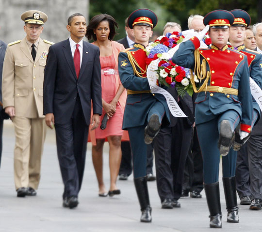 7月6日,在俄罗斯首都莫斯科,美国总统奥巴马向无名烈士墓敬献花圈。奥巴马当日抵达莫斯科进行为期三天的访问。