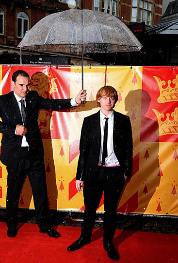 鲁伯特格林特冒雨参加首映式。