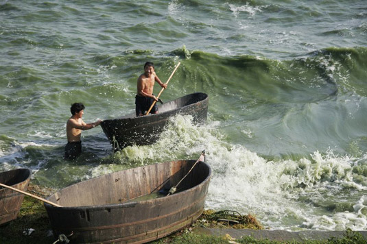 2009年7月8日,安徽巢湖东半湖出现大面积蓝藻,渔民在湖区所饲养的湖虾,渔民正在采取应急措施。李远波/CFP
