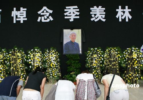 7月12日,北京大学搭设悼念季羡林先生的灵堂,供学校师生和各界人士前来祭奠。7月11日上午9时,北京大学教授、国学大师季羡林先生在北京辞世,享年98岁。中新社发 王天天 摄