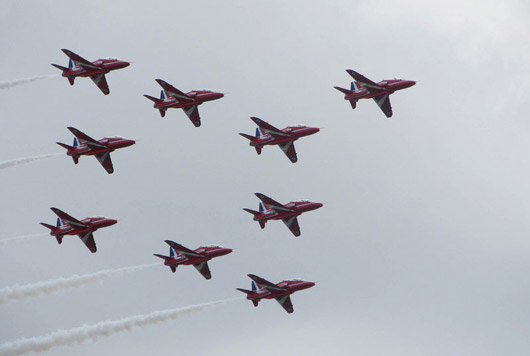 2009年7月12日,英国斯旺西,英国皇家空军“红箭”特技飞行表演队在首届威尔士航空表演节上进行特技飞行表演。