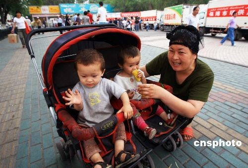 7月13日,新疆乌鲁木齐新华南路街头,一岁半的龙凤双胞胎兄妹巴特和马克吐拜尔在妈妈的陪伴下在街头玩耍。中新社发 刘新 摄