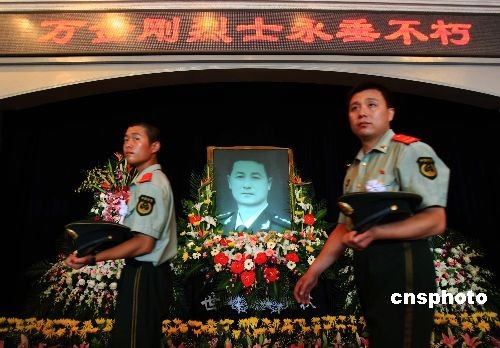 7月17日,在平息“七.五”暴力事件中英勇牺牲的武警上尉万金刚烈士遗体告别仪式在乌鲁木齐殡仪馆举行,社会各界人士前往吊唁。中新社发 刘新 摄