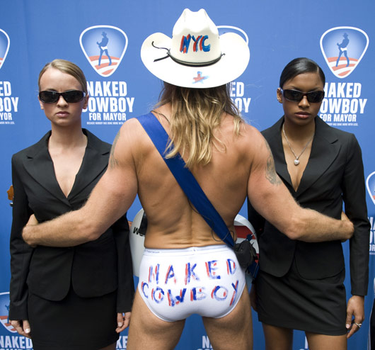 7月22日,在纽约时报广场卖艺多年的“裸体牛仔”罗伯特·布尔克召开新闻发布会,宣布将竞选下任纽约市长。他头戴牛仔帽,脚蹬牛仔靴,身着紧身短裤。纽约市长选举定于今年11月举行。